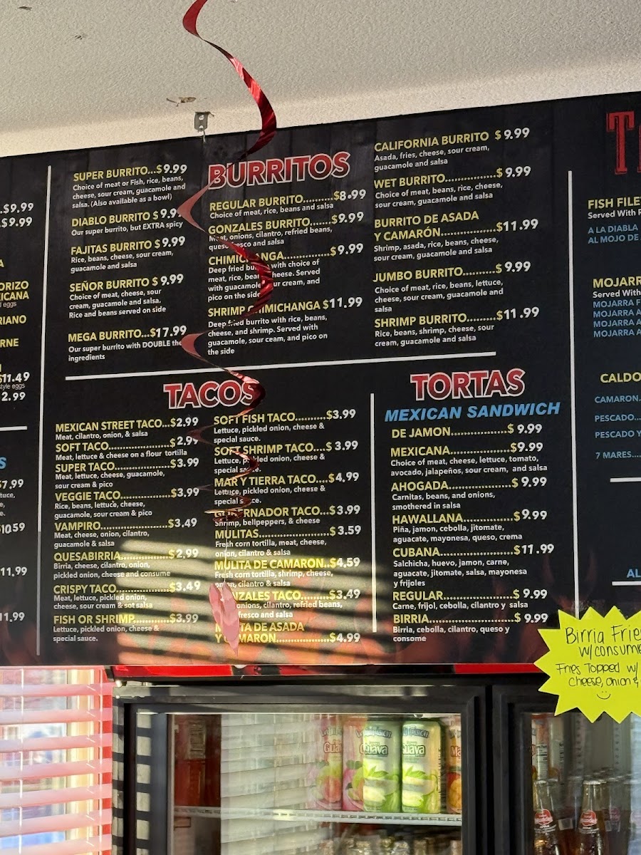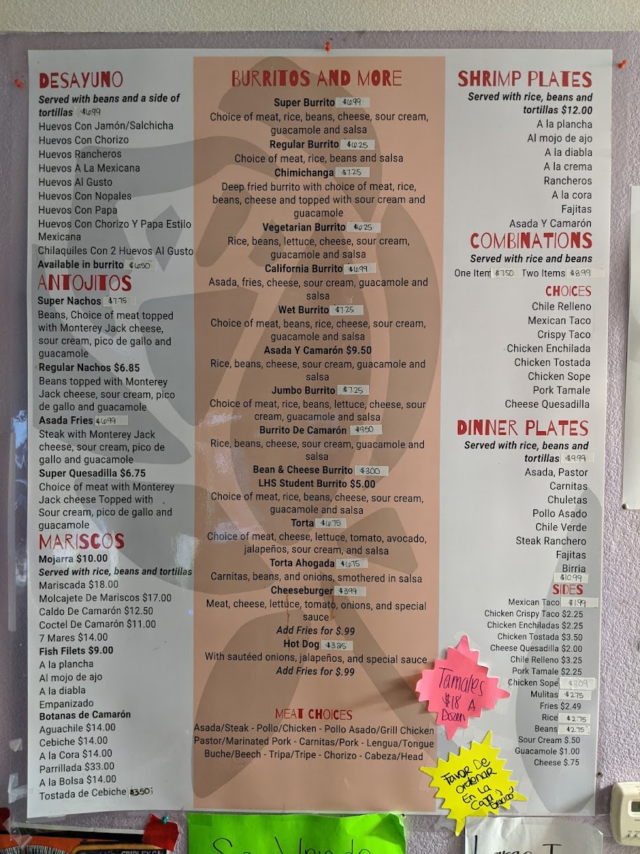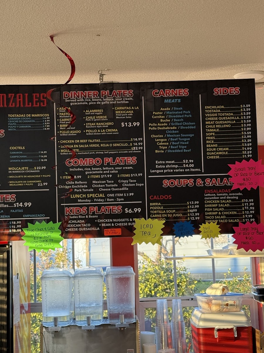 - Shrimp Plates— with selections like Asada Y Camaron ($18.99) and Fajitas Mixtas ($19.99), showcasing perfectly cooked seafood that bursts with flavor.